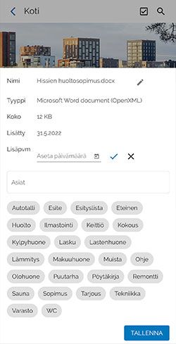 Voit hallita asiakirjaan kohdistuvia asiasanoja, jotka auttavat sinua myöhemmin tekemään hakuja asiakirjastoonLopuksi valitse "TALLENNA"