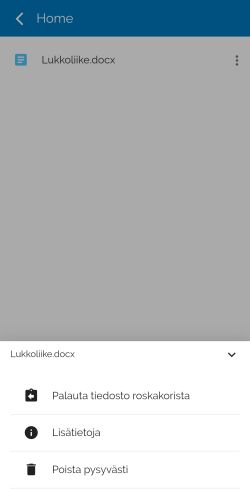 - Valitsemalla Palauta tiedosto roskakorista asiakirja palaa samaan paikkaan kohteen asiakirjastossa, mistä sen poistit